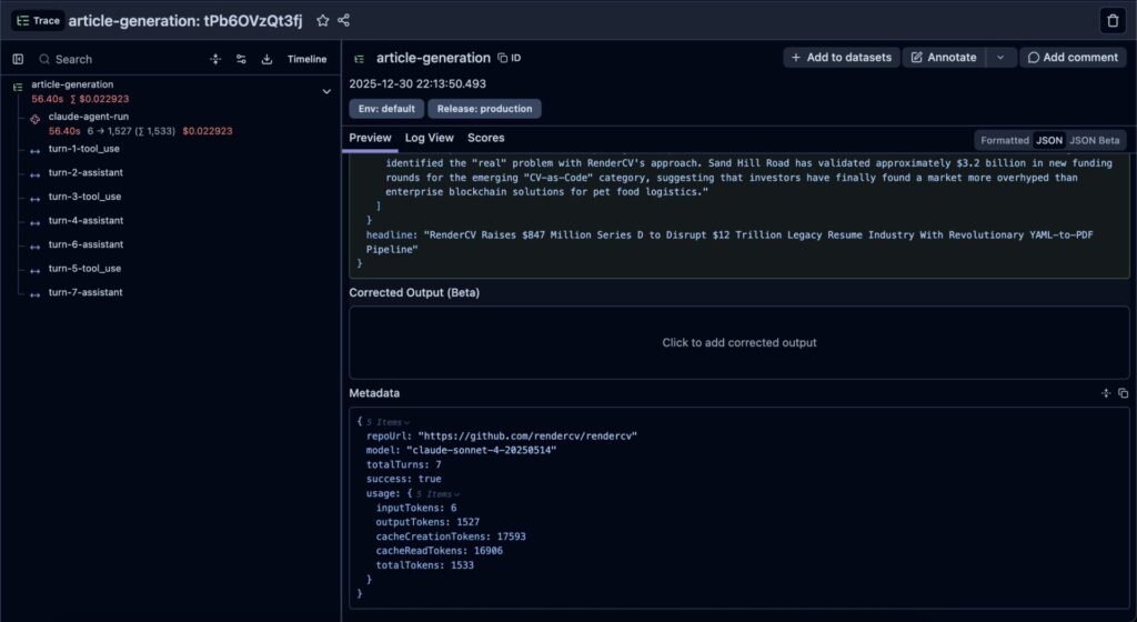 Originally, it dove deep into what framework the project was using or how specific functions were implemented. This made the article very technical, but also used a lot of agent turns. And in the end, these technical details didn’t make the article better, in my opinion.